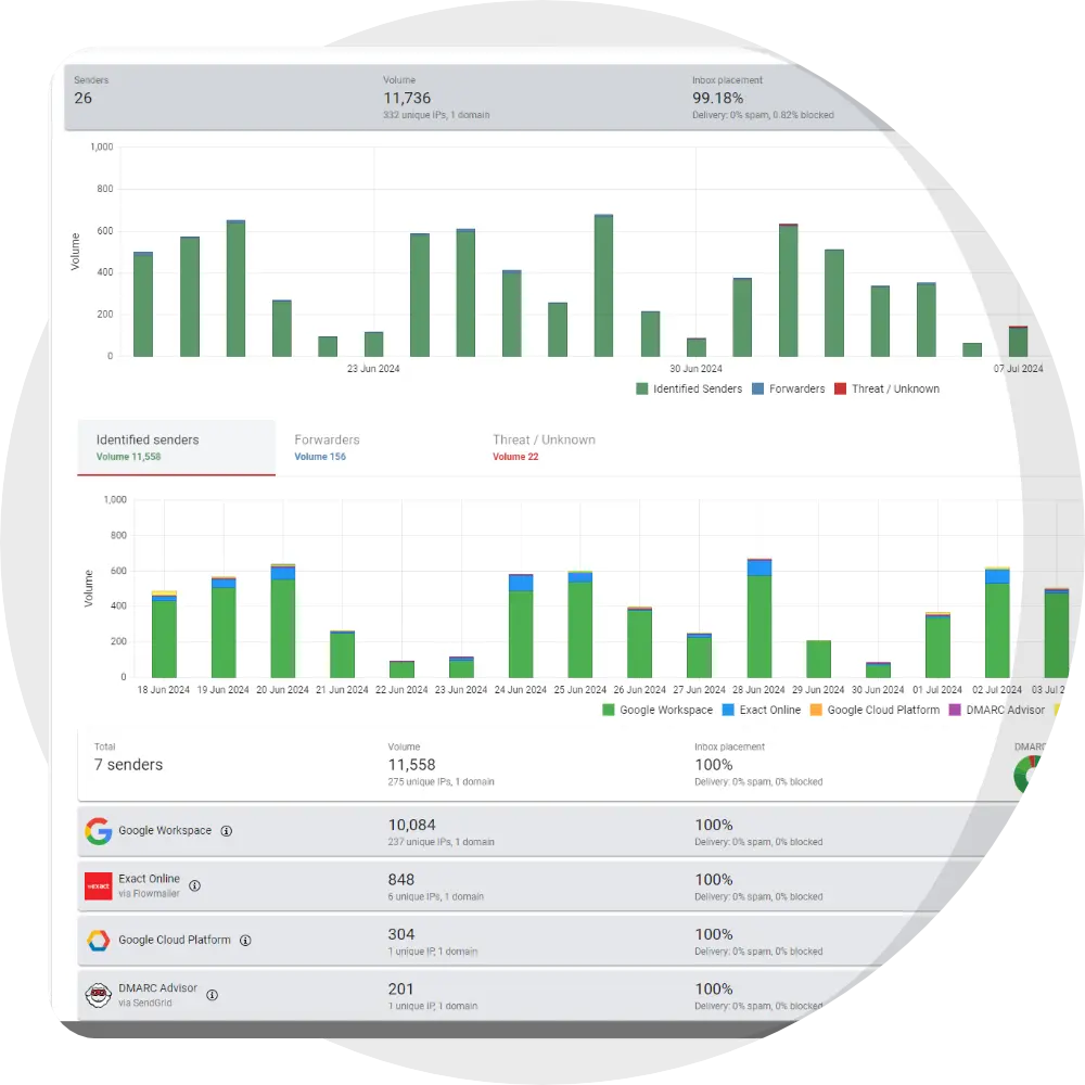 The platform focuses on essential DMARC components like SPF and DKIM authentication results, allowing users to move towards a stricter DMARC policy. It presents data in graphs and tables, which can be useful for understanding email flows, but we noticed a lack of advanced features found in more comprehensive solutions, such as extensive forensic reporting (RUF) or integrated tools for SPF flattening and blocklist monitoring.