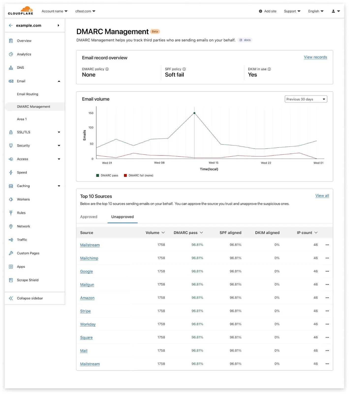 Cloudflare's DMARC management integrates seamlessly into its existing dashboard. For current Cloudflare users, this provides a familiar environment and a cohesive experience across their security stack. The interface is clean and generally easy to navigate, especially for those accustomed to the Cloudflare UI.